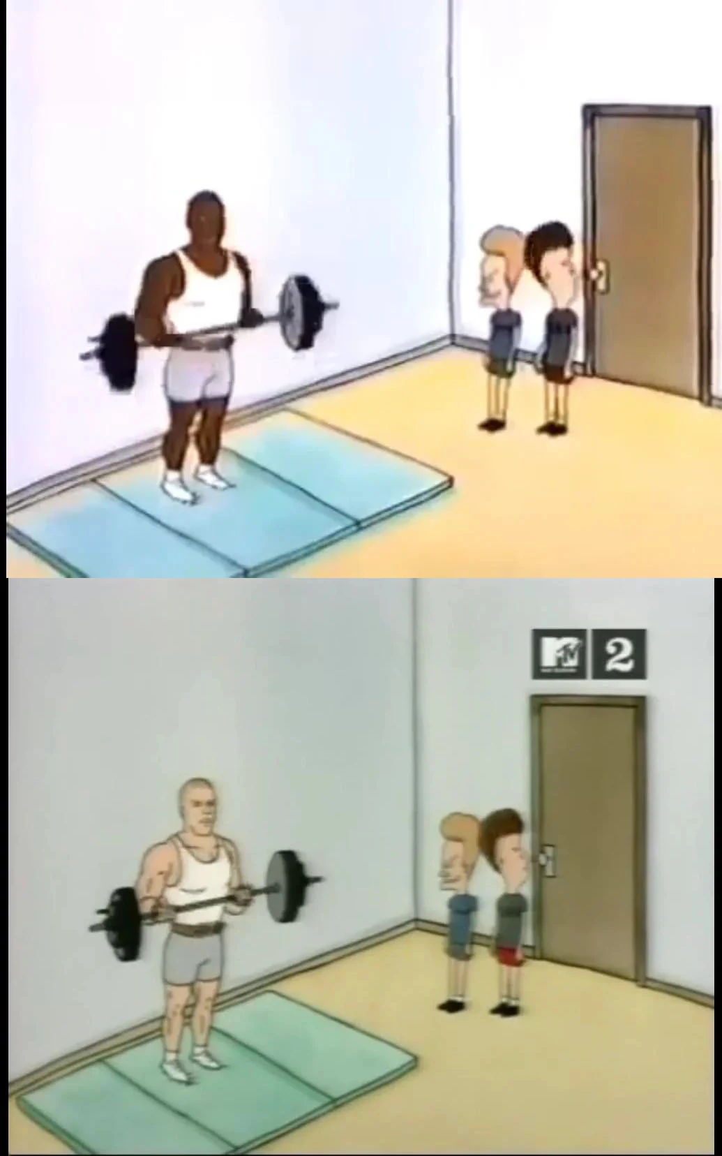 A man lifting weights tells Butt-Head to spot him, but he quickly leaves him when Beavis points out what he thinks is a woman on a stair master. They stare at the wedgie in “her” spandex when it's revealed to be a long-haired man, much to their astonishment.