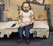 For most of his single appearance, his eyes were only visible from under his bed, with his arms appearing occasionally to reach something. He is eventually revealed to be a Harry Sachz lookalike, being a thug with multiple tattoos, chin-curtain beard, and a dark brown mullet with a receding hairline. He is also shown to wear false teeth, which fall out when he gets attacked by a cop before his execution.